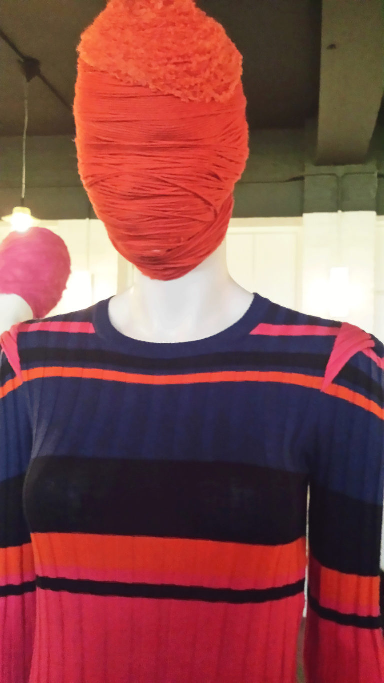 Déclinant le thème de la rayure et du carreau, les modèles hauts en couleurs étaient présentés sur des mannequins à la tête recouverte de laine, pour prolonger ces silhouettes jusqu'aux boutistes.