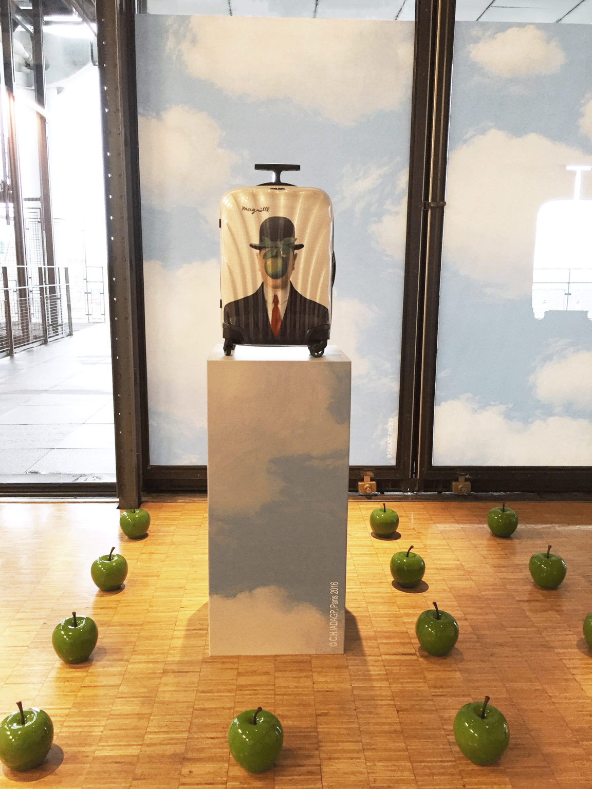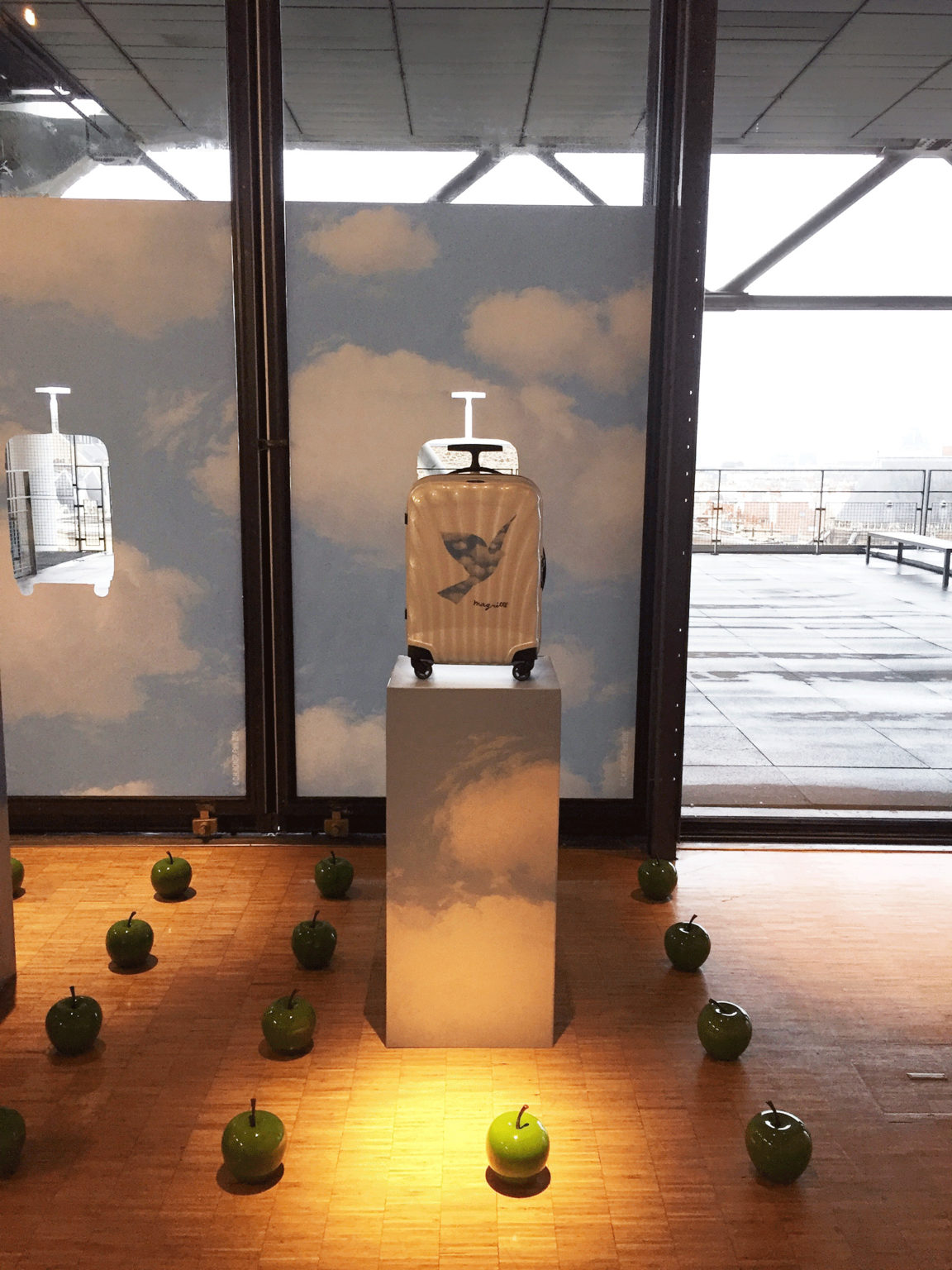 Dans une des salles de conférence du Centre Pompidou ont été révélées deux valises en série limitée inspirées du peintre Magritte.